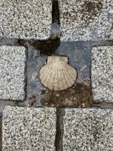 This route is part of a vast web of pilgrimage trails that converge on the grave of the apostle Jacob in Santiago de Compostela in Spain. Since the Middle Ages the shell has been the symbol of the traveller on these trails and can been found showing the way on trees, walls, and fenceposts. The grooves on the shell represent the convergence of all trails in Spain.